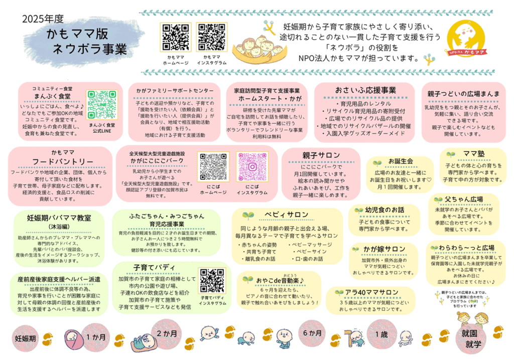 妊娠期から子育て家族にやさしく寄り添い途切れることのない一貫した支援を行うネウボラのような役割をNPO法人かもママが担っています。