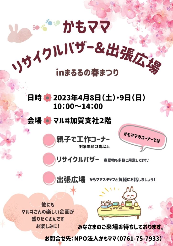 リサイクルバザー&出張広場 inまるるの春まつり Posted 2023年4月12日 kamomama_kaga 開催日: 2023年4月8日 10:00 AM - 2023年4月9日 2:00 PMカテゴリー: その他